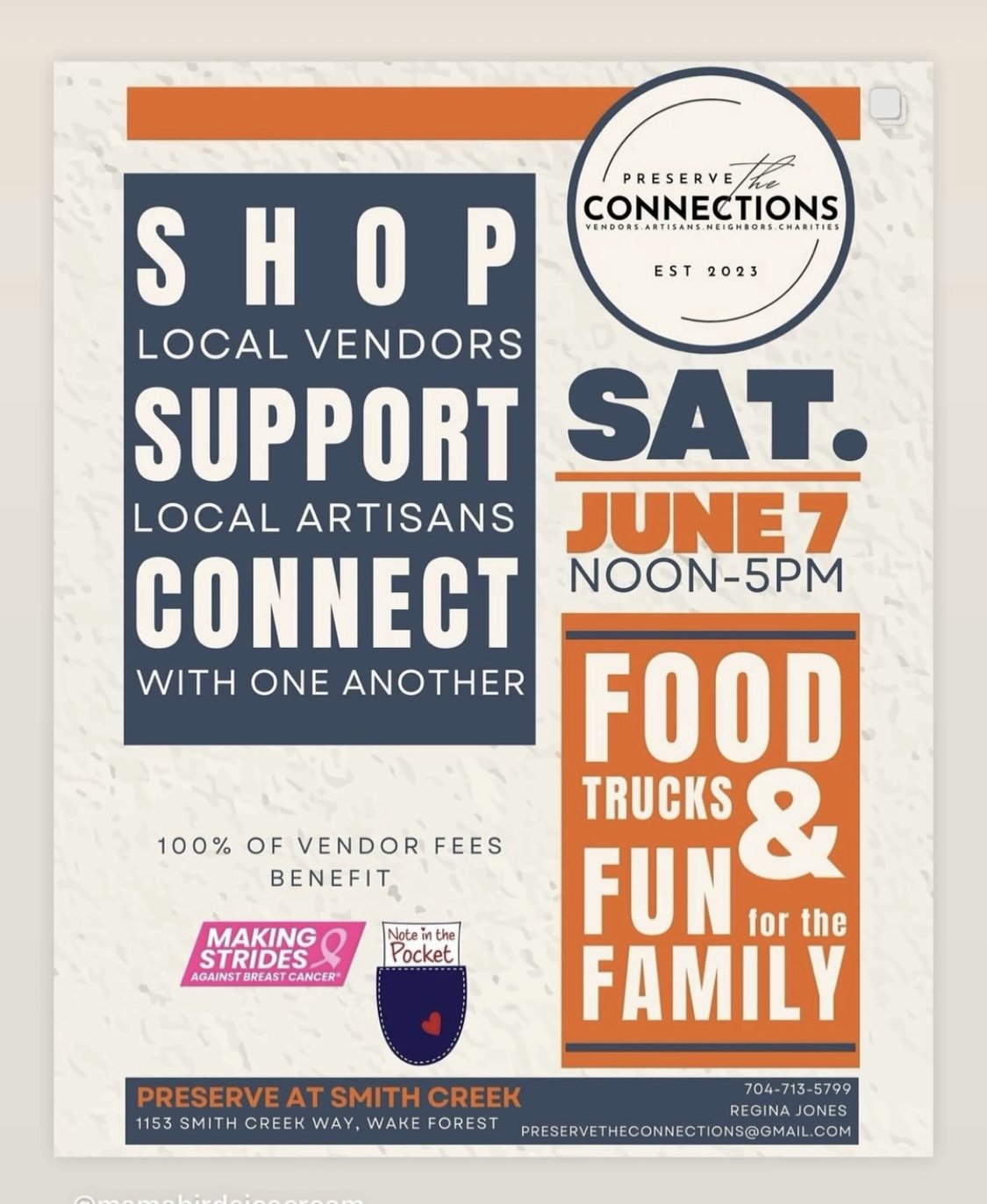 The Preserve at Smith Creek in Wake Forest is hosting a festival and fundraising event that includes a clothing drive for Note in the Pocket. You will represent Note by staffing a table where attendees can learn about Note in the Pocket -- our mission and volunteer opportunities.
